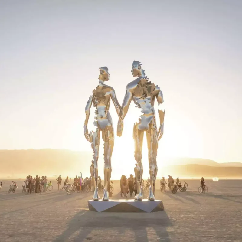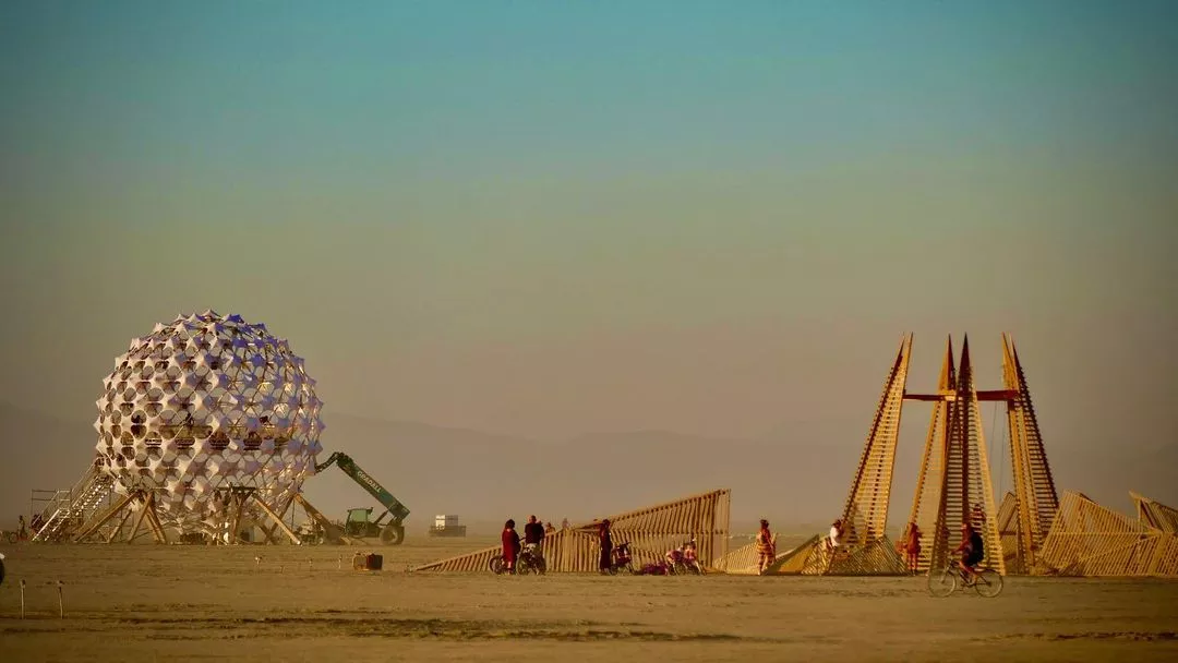 它的历史便是火人节(Burning Man Festival),这个你很难去用简单的词汇进行概括的庆典。说是艺术事件,也的确如此,有许多光怪陆离的艺术装置会停在这座其余357天都荒无人烟之地;说是文化消费目的地,也似乎贴切,尽管这里交通不便、景点缺缺、甚至难以如厕,但人们还是争相而来,唱歌、跳舞、cosplay、露营、煮菜;但又有些神奇的宗教感,譬如在空地上围成圈燃烧一个木制男性雕像的惯例仪式——或者你去看看这个场景,广阔但荒芜之地,配上狂热的Burner(参与者的统称),最前沿的大型装置,一切共同形成了一种荒诞的冲突感,仿佛末世降临的那天。