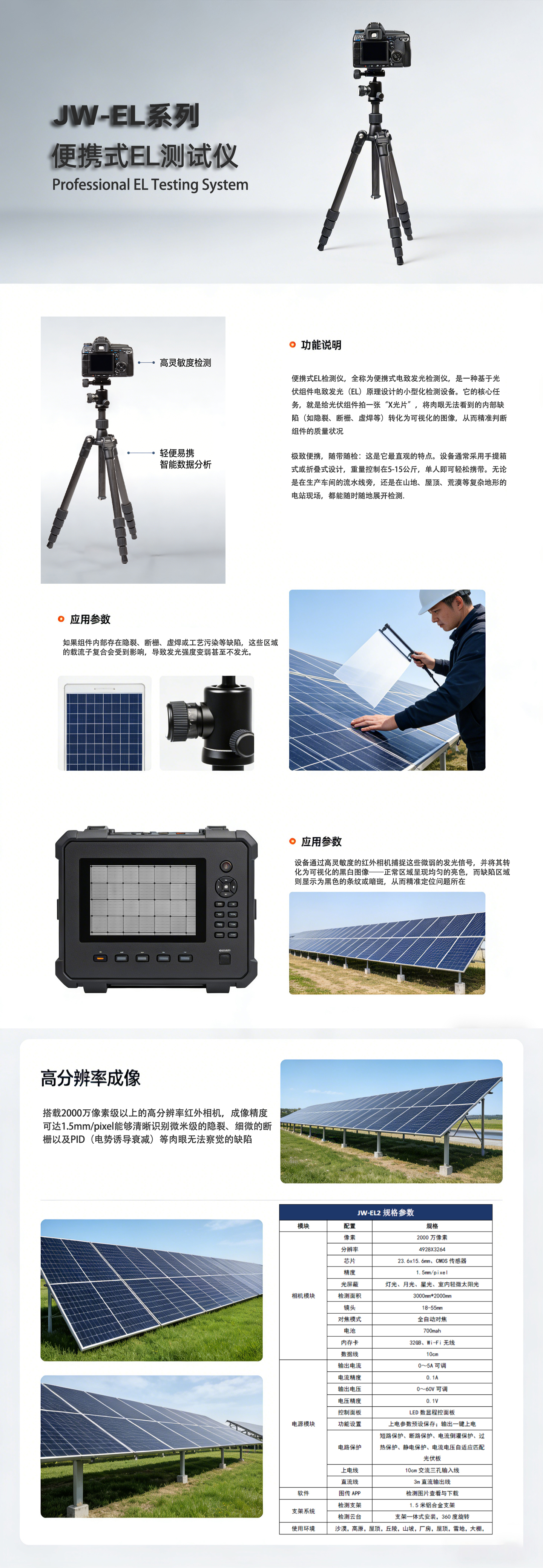 便携式EL检测仪,专注于检测光伏电站及移动式组件标准检测设备,在,白天夜晚均可准确检测出光伏太阳能板内部质量问题,包括:断栅、隐裂、破片、碎片、虚。焊、烧结网纹、黑芯、黑边、混档、低效率片、边缘过刻、PID、衰减、热斑衰减等参数。整机配套全新的物联网模块与A智能分析系统,可更好的帮助用户完成产品的图像识别与检测报告的缺陷定位。